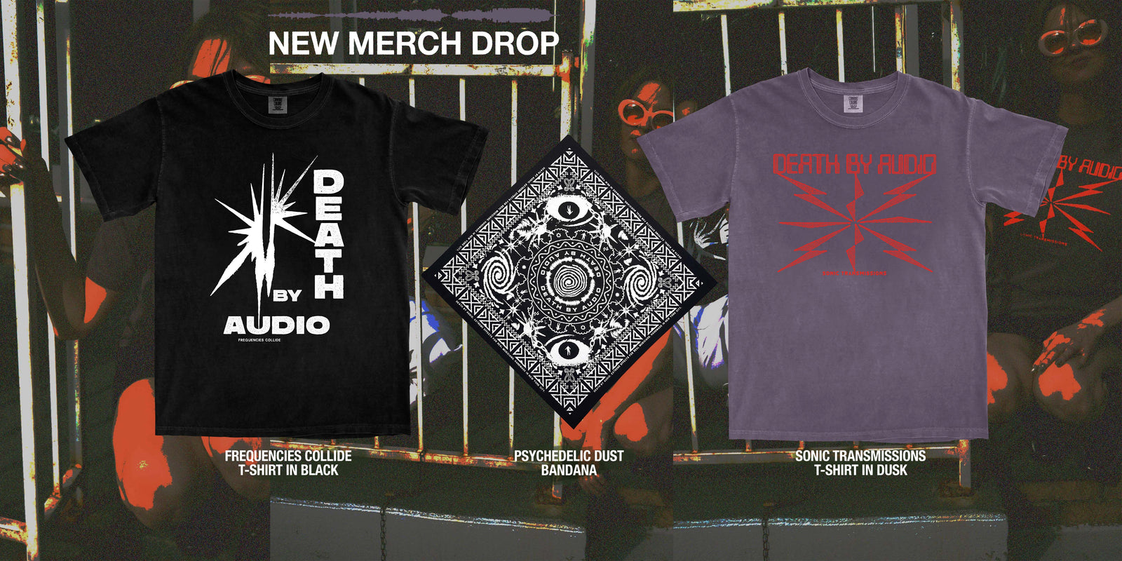 Death By Audio Accessories. Raw Power, our power supply, and Mic Stand Clip Backplate that attaches our vocal pedals to your mic stand. Glow in the dark guitar picks and our Photo Modulator, expression using light. Plus, cables from TourGear Designs.