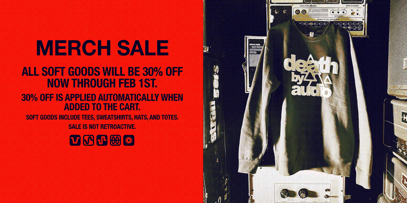 Death By Audio Accessories. Raw Power, our power supply, and Mic Stand Clip Backplate that attaches our vocal pedals to your mic stand. Glow in the dark guitar picks and our Photo Modulator, expression using light. Plus, cables from TourGear Designs.