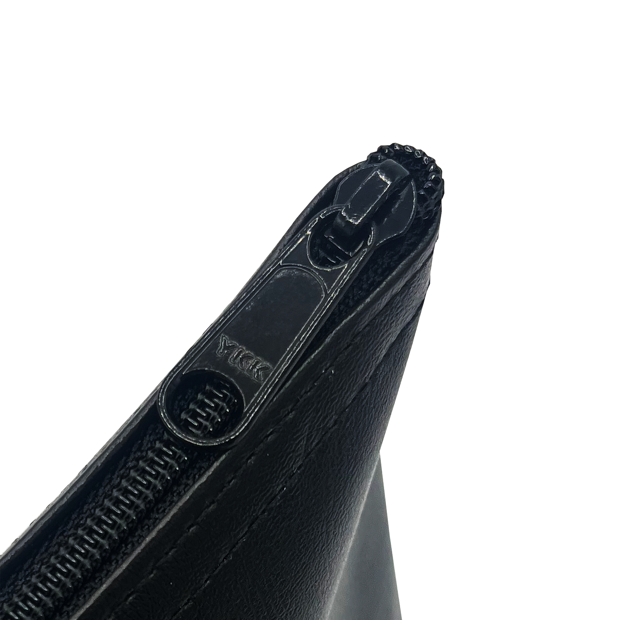 Built for the road in durable vinyl with a sturdy YKK zipper. Features a bold, hypnotic red print on black. Single compartment.
