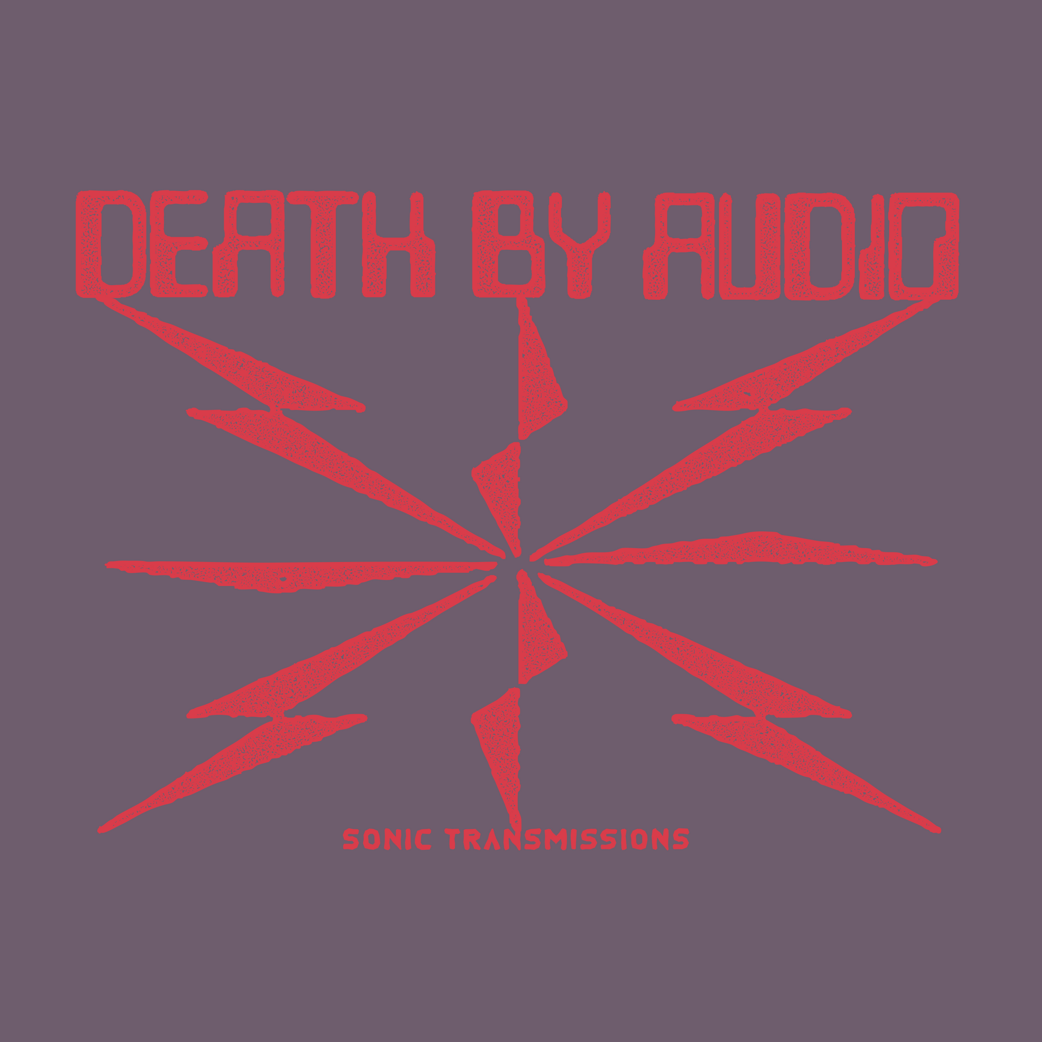 Signals ripple and distort. Bold red graphics on dusk (muted plum).