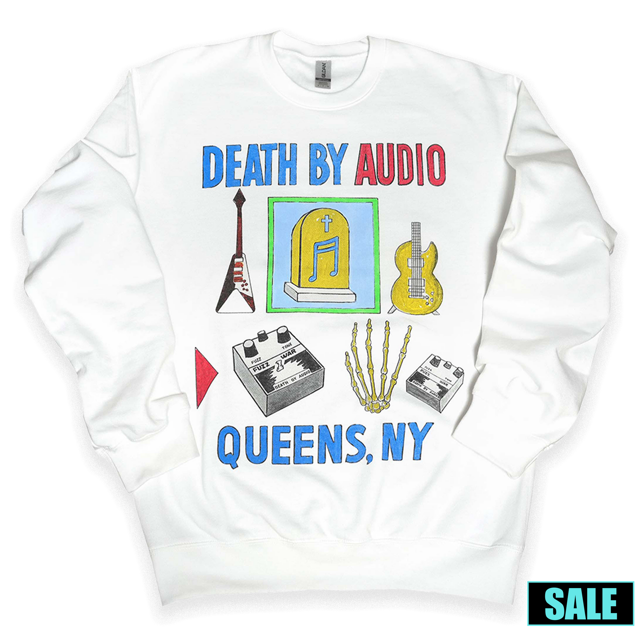Death By Audio x Cevallos Brothers collab on a suuuuper-soft white crewneck lightweight sweatshirt.